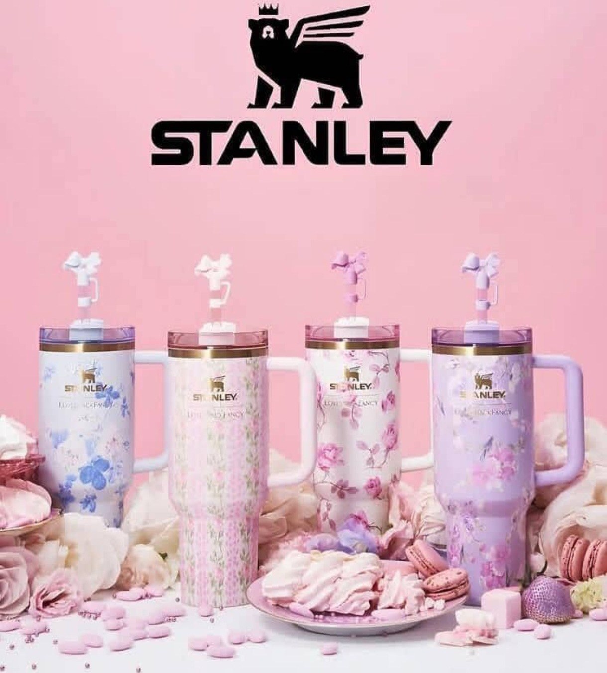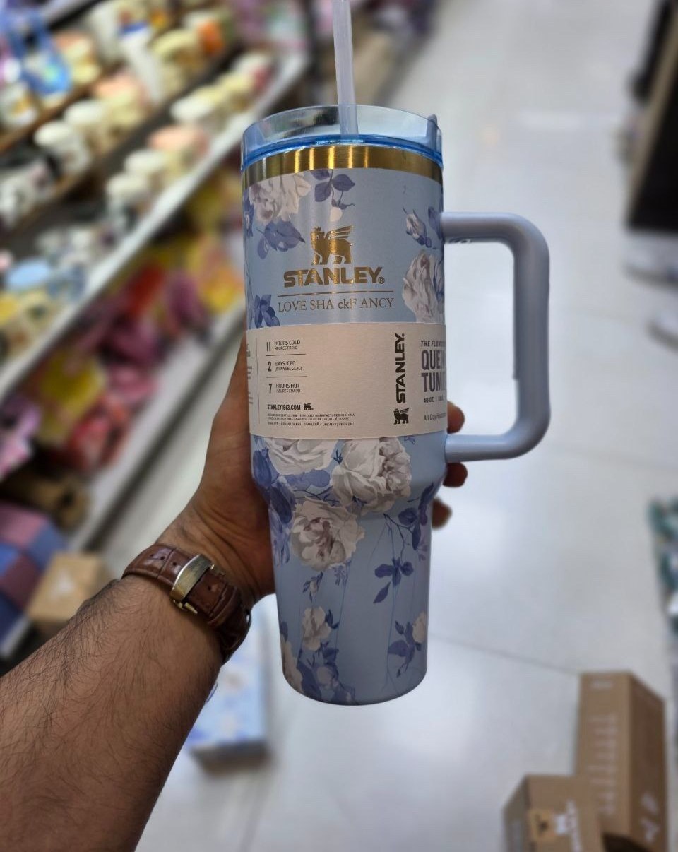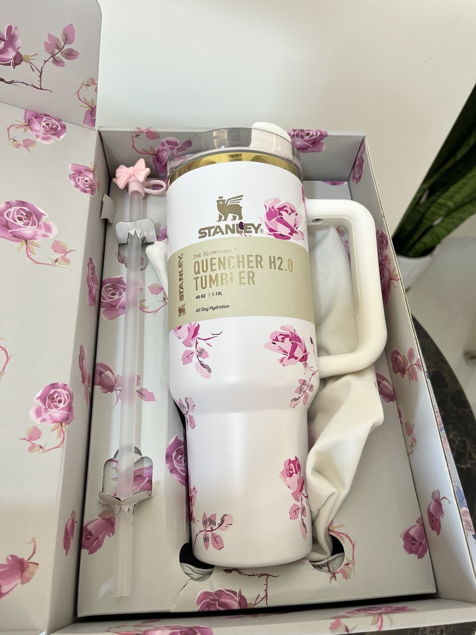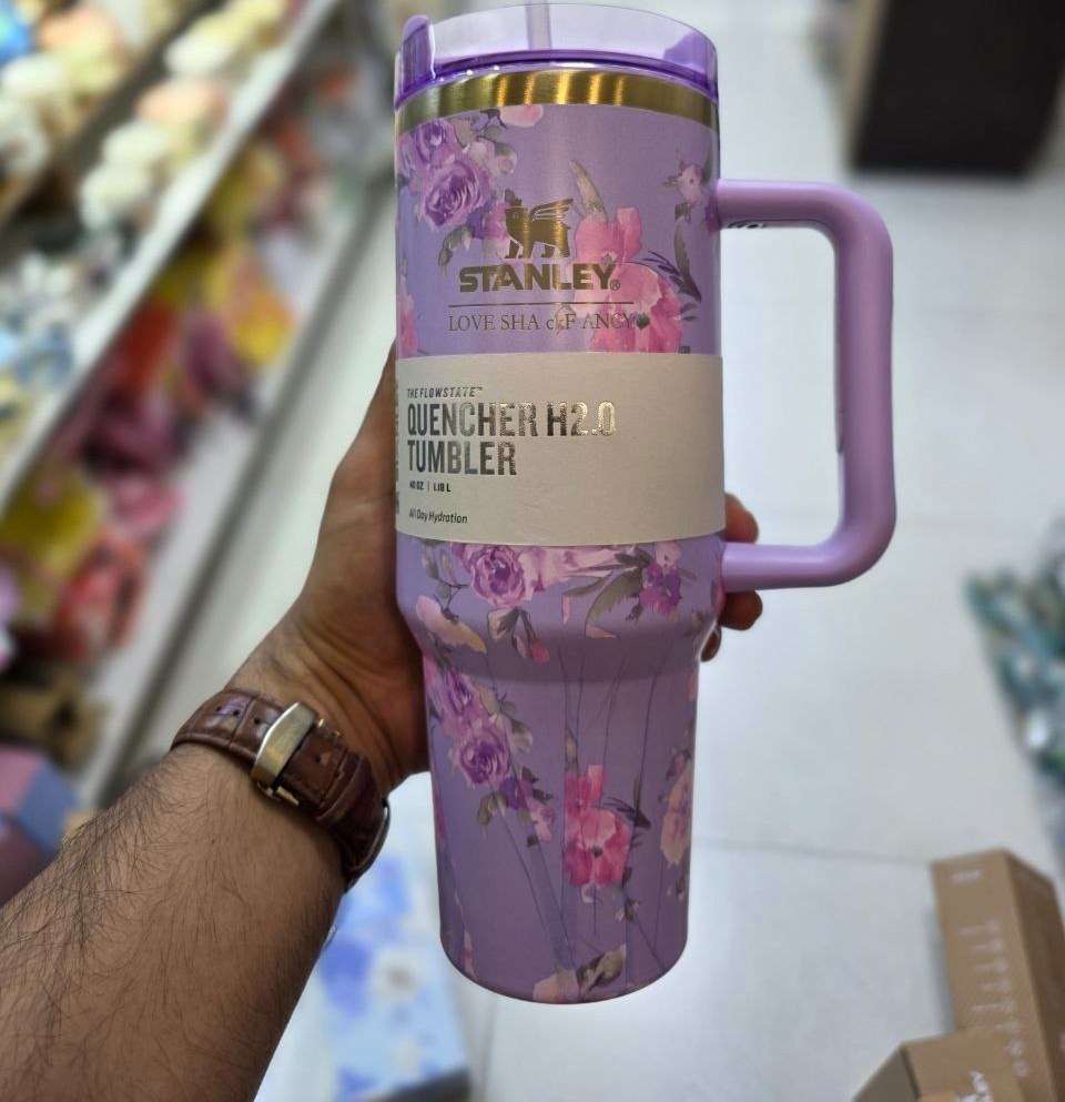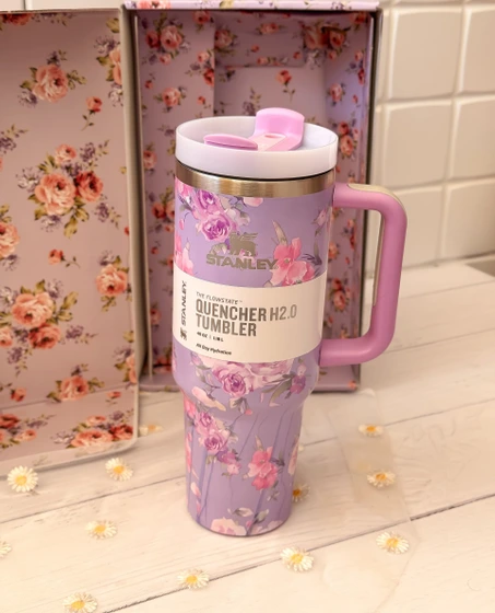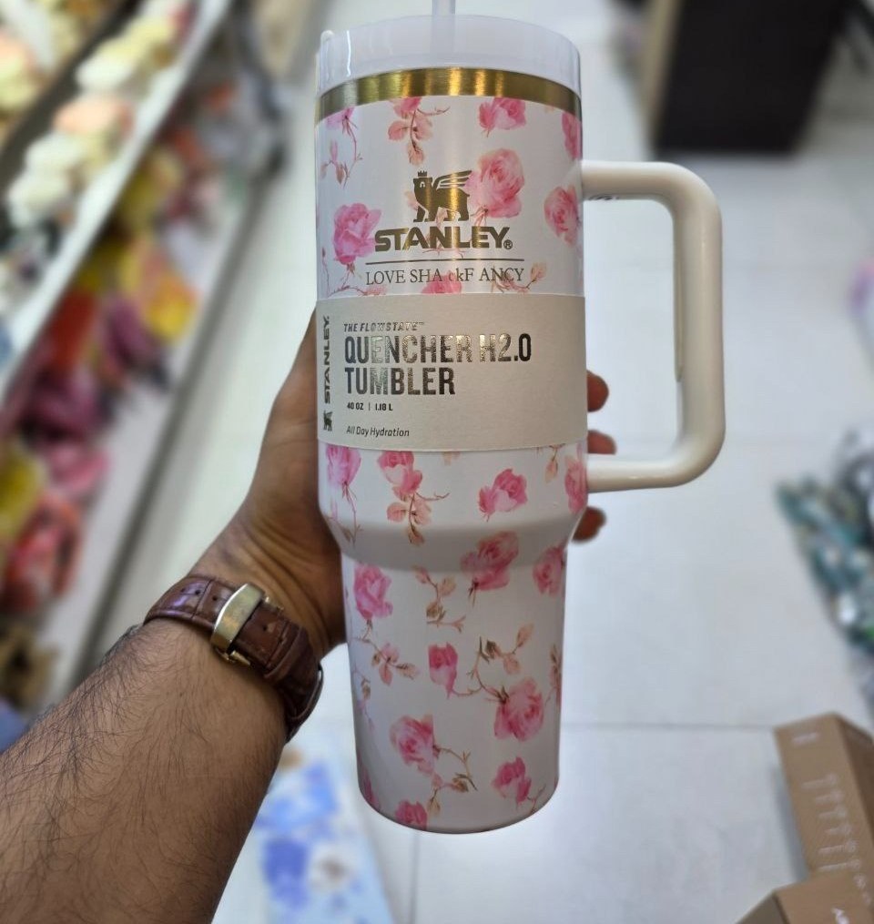 ماگ استنلی Quencher باربی گل دار 1.18 لیتر، دارای بدنه استیل دوجداره، نی مخصوص، طراحی آسان نوش، ظرفیت بالا و قابلیت نگهداری یخ بیش از ۲۴ ساعت، مناسب برای سفر و استفاده روزانه.